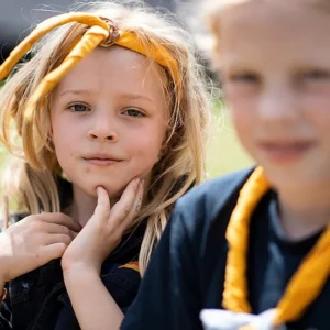 Und woran erkennt man einen Wölfling? An seinem gelben Halstuch und am Wolfskopf auf seinem Hemd.